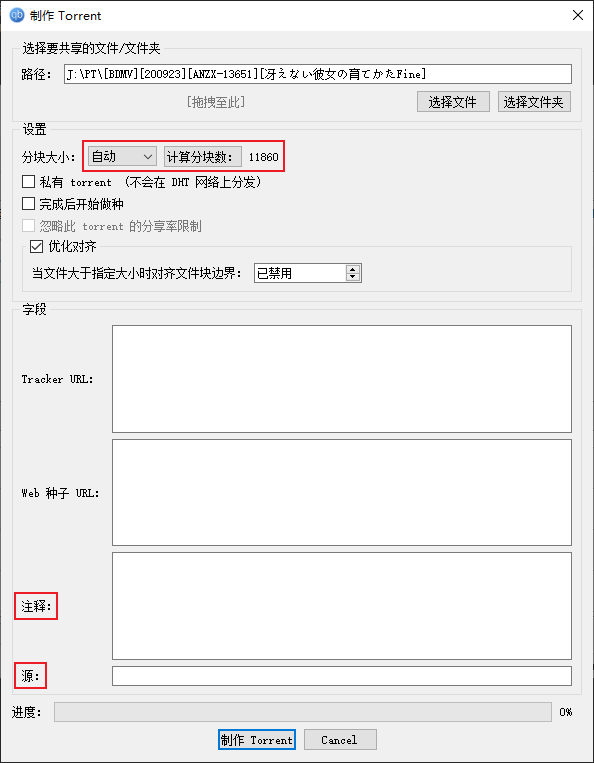 选择 4~16MiB,控制分块数在 2 万内。不知道选多少请无脑 16MiB,选好后可以「计算分块数」私有 torrent